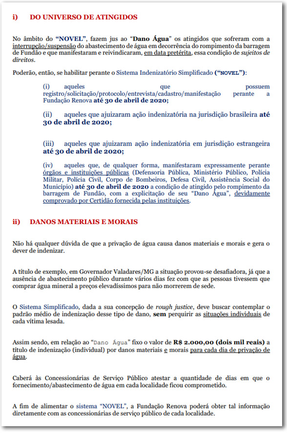 O juiz Mário de Paula estabeleceu valores: o “Dano Água” vai indenizar com R$ 2 mil por cada dia que o impactado tenha ficado sem o abastecimento de água potável, lembrando que se enquadram neste caso todas as pessoas que tenham feito cadastro/manifestação como atingidos até o dia 30 de abril de 2020, junto à própria Fundação Renova ou em órgãos como Corpo de Bombeiros, Prefeitura ou Polícia Militar, entre outros, ou que tenha ajuizado ação no Brasil ou no estrangeiro.