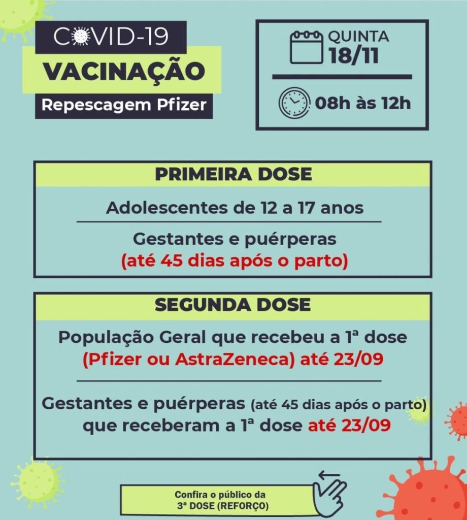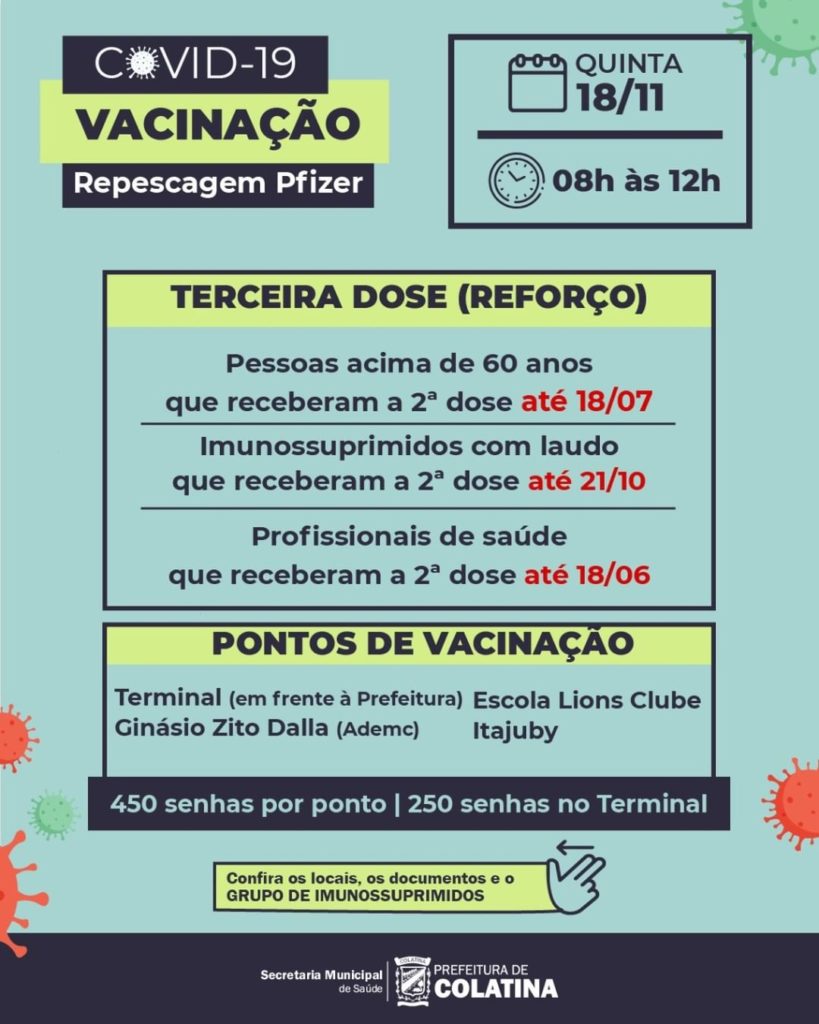 A Secretaria de Saúde de Colatina informa que a repescagem da Pfizer nesta quinta-feira (18), com diversos pontos de vacinação espalhados pela cidade.