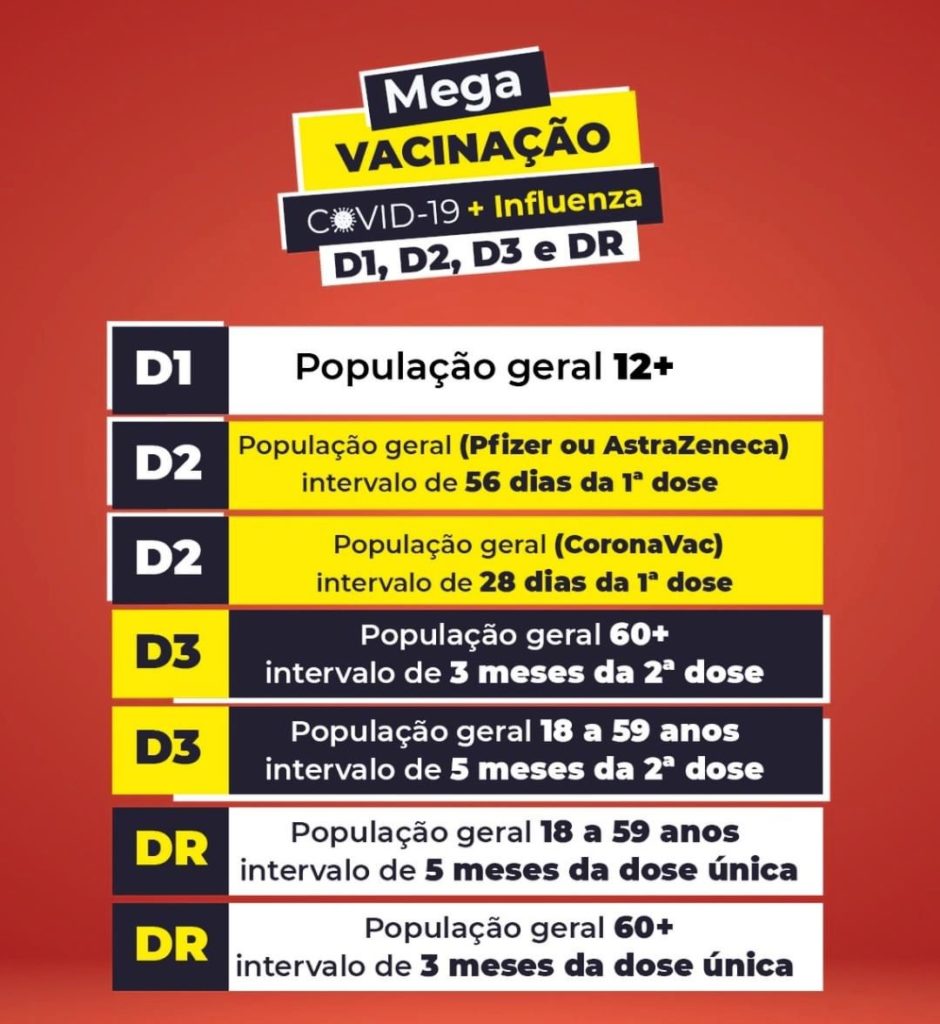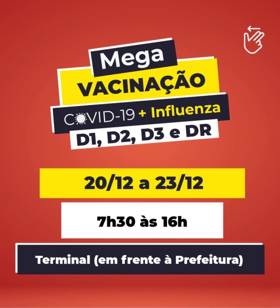 A Secretaria de Saúde de Colatina informa que será o cronograma de vacinação na semana do Natal. A vacinação vai ocorrer de segunda-feira (20) até quinta-feira, dia 23, no mesmo horário habitual, das 7h30 às 16h, no Terminal de ônibus.