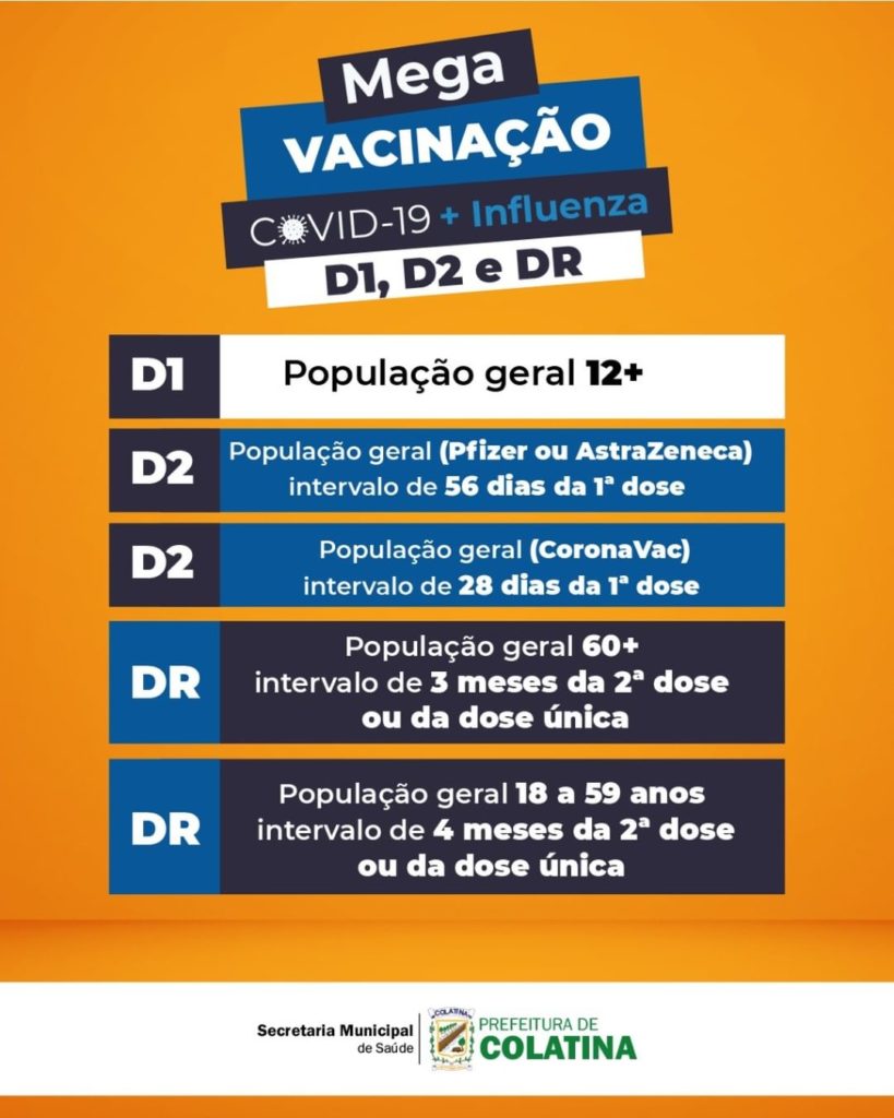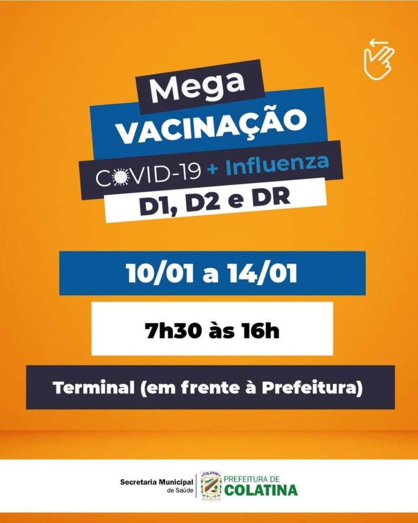 A Secretaria de Saúde de Colatina comunica, fique atento ao cronograma de vacinação desta semana: vai funcionar de segunda a sexta-feira, das 🕓 7h30 às 16h, no Terminal de ônibus.