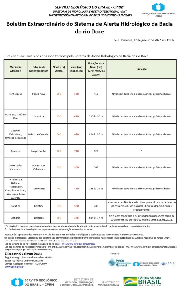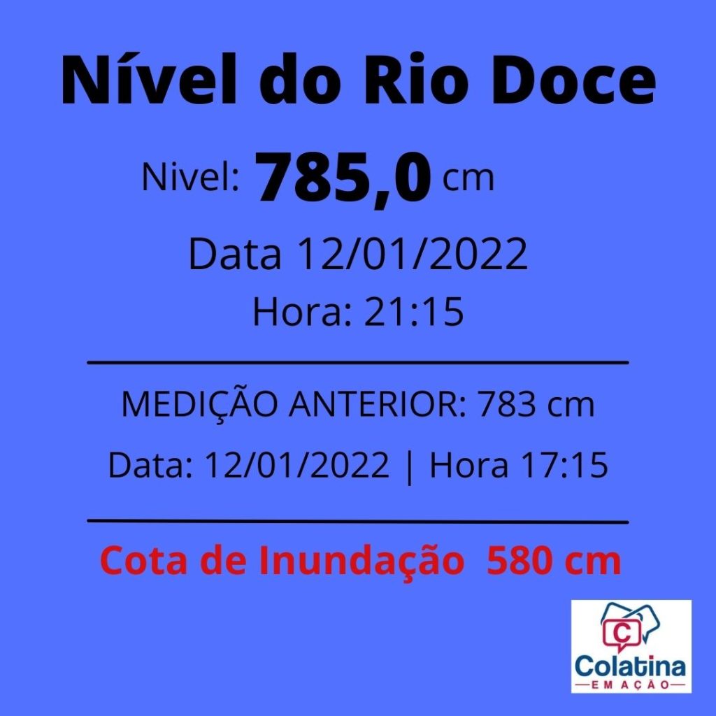 Conforme Boletim Extraordinário do Sistema de Alerta Hidrológico da Bacia do rio Doce, do SERVIÇO GEOLÓGICO DO BRASIL ‐ CPRM, emitido às 22 horas desta quarta-feira 12, o nível do Rio Doce em Colatina, com tendência a estabilizar podendo oscilar em torno da cota 795 cm nas próximas horas e depois diminuir gradualmente.