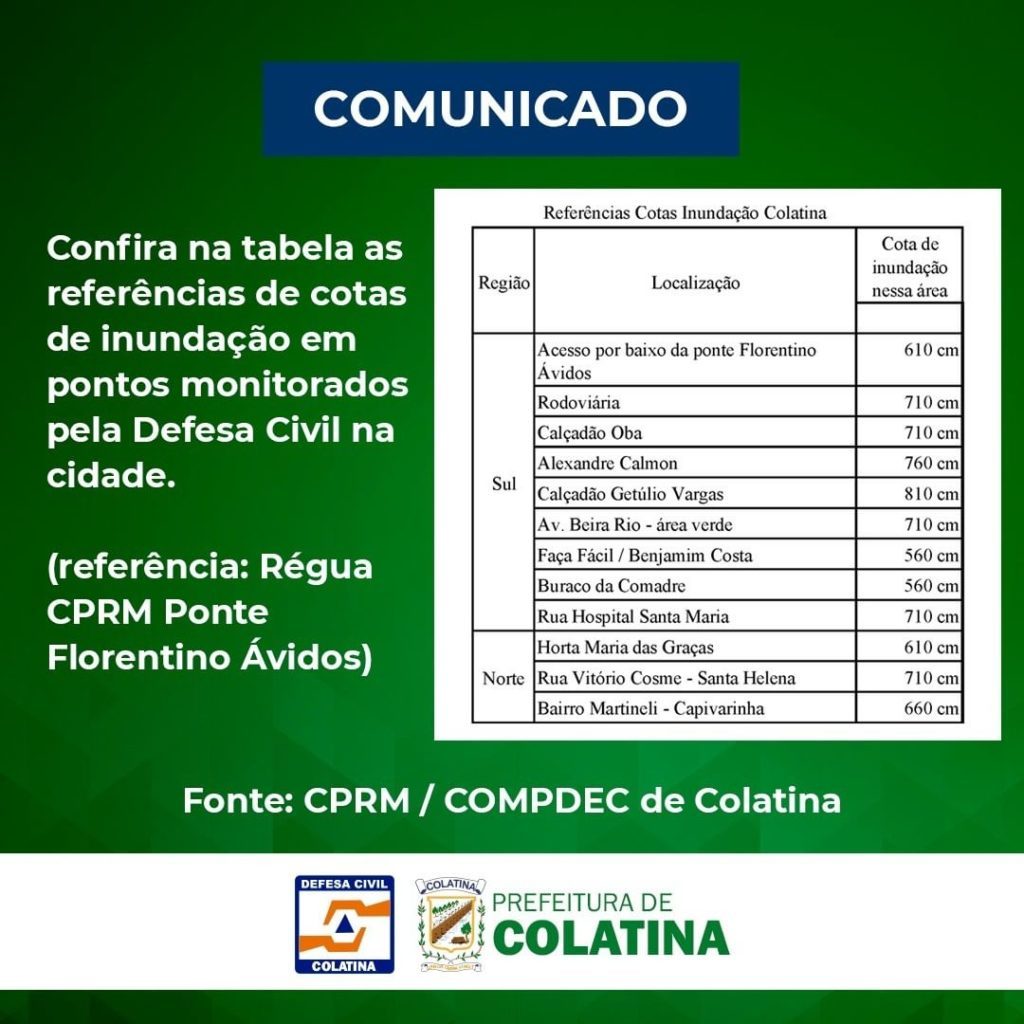 Confira no comunicado da Prefeitura de Colatina, quais as regiões onde a inundação do Rio Doce de acordo com a elevação do nível do rio.