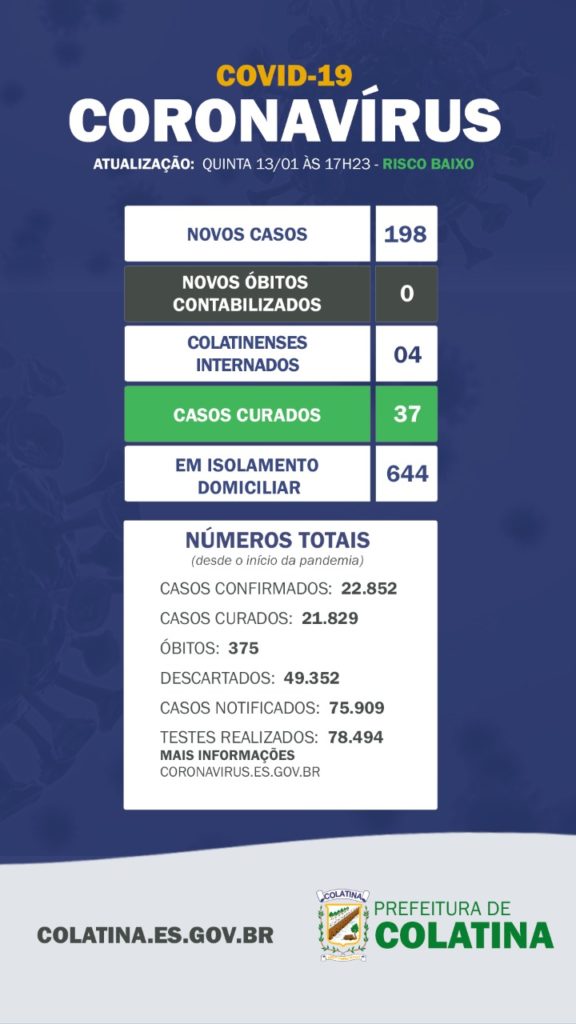 Boletim da Secretaria de Saúde de Colatina divulgado na tarde desta quinta-feira(13), confirma mais 198 novos casos, 04 pacientes estão internados. Em isolamento domiciliar 644 pacientes. O total de casos positivos em Colatina agora é de 20.140 pacientes infectados, desde o início da pandemia.