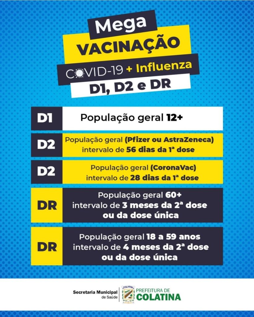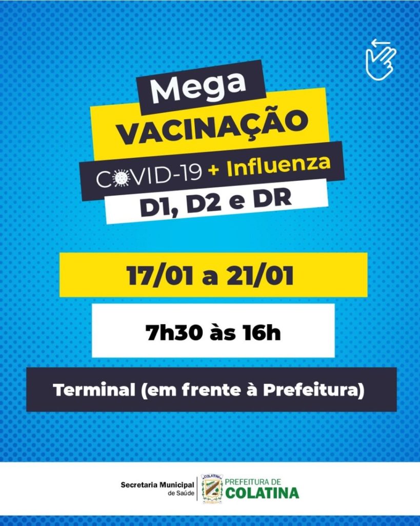 A Secretaria de Saúde de Colatina, informa o cronograma de vacinação desta semana, a secretaria convida a todos que venham completar a sua imunização: vai funcionar de segunda a sexta-feira, das 🕓 7h30 às 16h, no Terminal de ônibus.