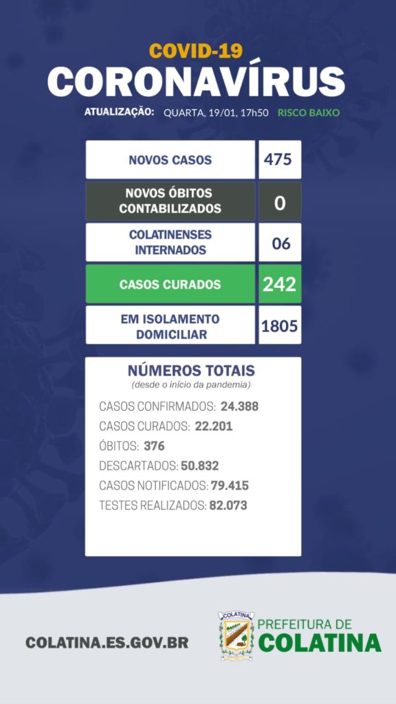 Até o momento foram registrados 376 óbitos por Coronavírus em Colatina, 22.201 pacientes estão considerados curados. O total de casos notificados chega a 79.415, testes realizados 82.073