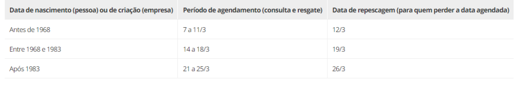Ao fazer esta primeira consulta, o cliente do banco recebe uma data e período para consultar e solicitar o resgate do saldo existente. As datas são agendadas de acordo com o ano de nascimento da pessoa ou da criação da empresa, conforme calendário abaixo.
