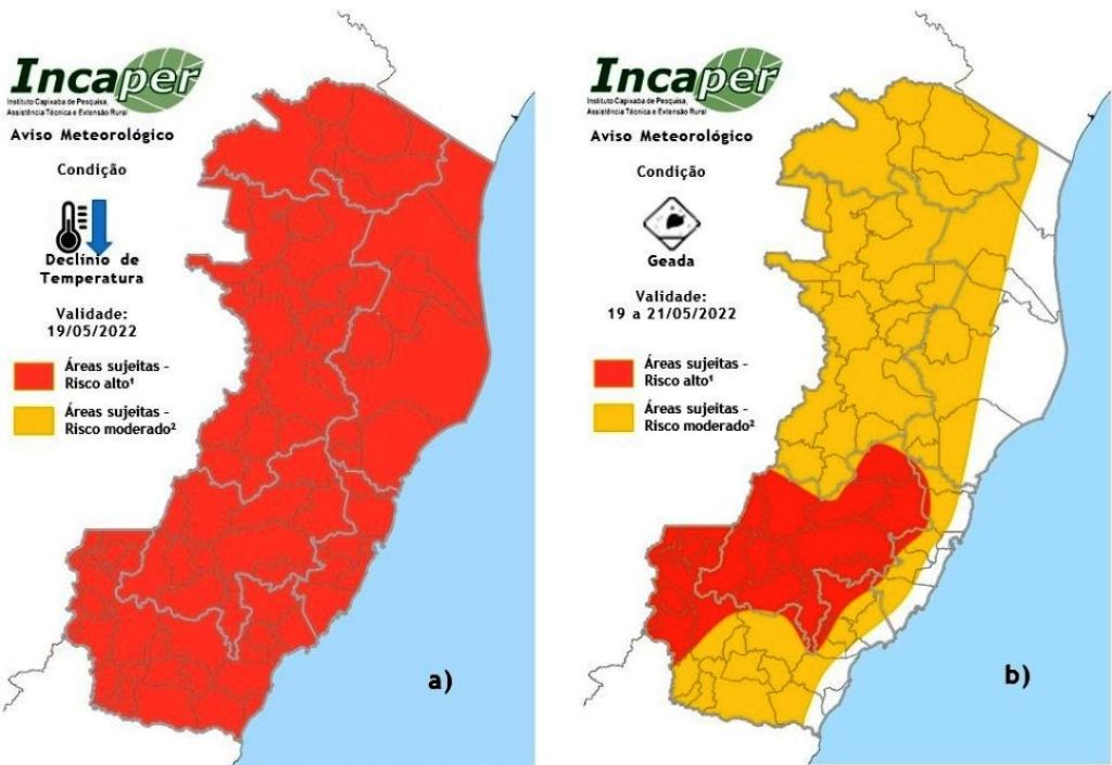 De acordo com o Incaper o nível de atenção devido às condições meteorológicas favoráveis para ocorrência de declínio na temperatura, que pode resultar em temperaturas mínimas de até 5 ºC inferiores à média climatológica para o mês de maio, conforme destacado na área vermelha da figura “a”. Durante esse período, segundo o Incaper, na área vermelha em destaque na figura “b”, as condições são favoráveis para o risco de formação de geada na vegetação.