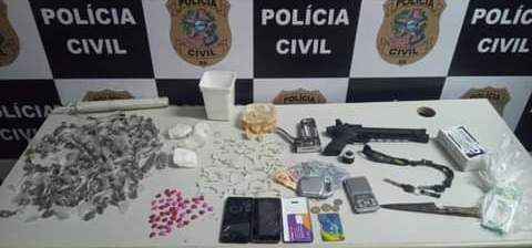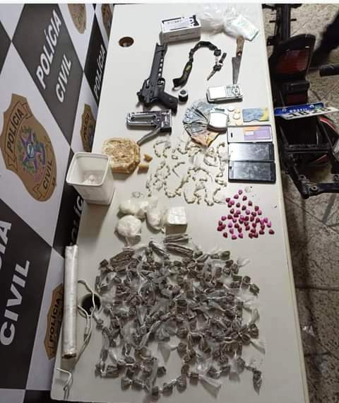 Os policiais apreenderam ainda 194 buchas de maconha e 116 pedras de crack, ambas embaladas para venda, 506g de crack, divididos em 3 pedras, 46 comprimidos de droga sintética e 161,5g de pasta base para cocaína e um simulacro de arma do fogo,