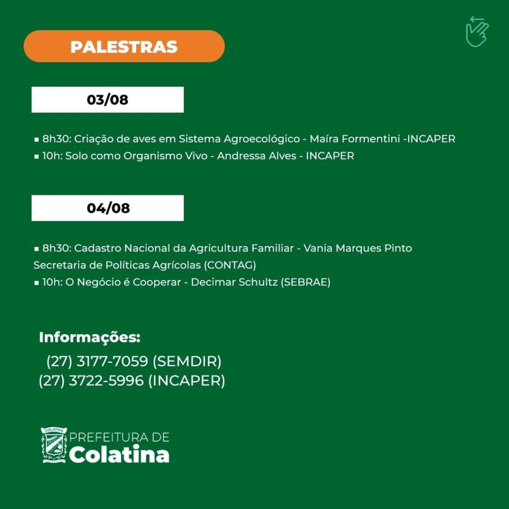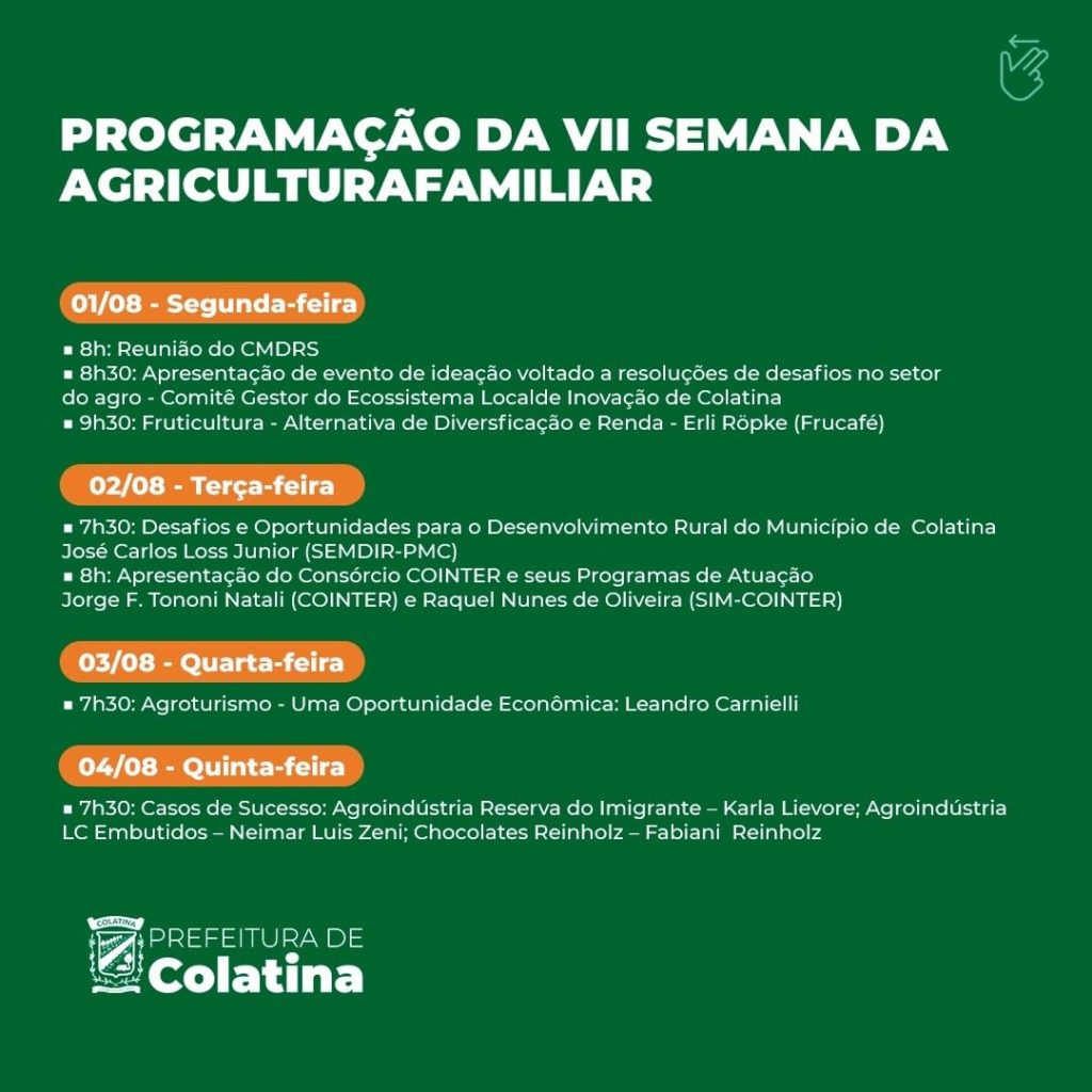 De 1º a 05 de agosto acontece a VII Semana da Agricultura Familiar, que vai reunir produtores rurais de todo o estado em uma programação com cursos, palestras, workshops, consultorias e apresentação de cases de sucesso de diferentes segmentos do setor.