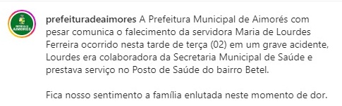 Em sua rede social a Prefeitura de Aimorés emitiu Nota de Pesar
