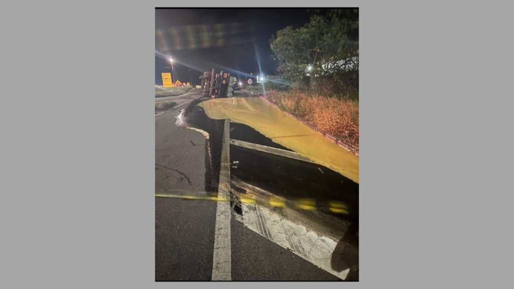 Parte da carga ficou derramada na pista e sobre a vegetação nas margens da rodovia.