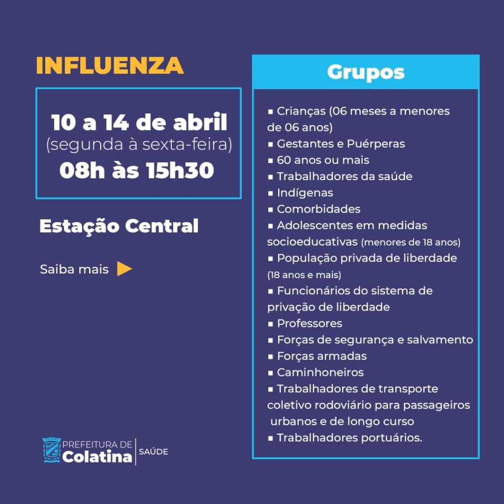 A vacinação acontecerá das 8 às 15 horas, na Estação Central. E lembrando que as duas vacinas podem ser aplicadas simultaneamente.