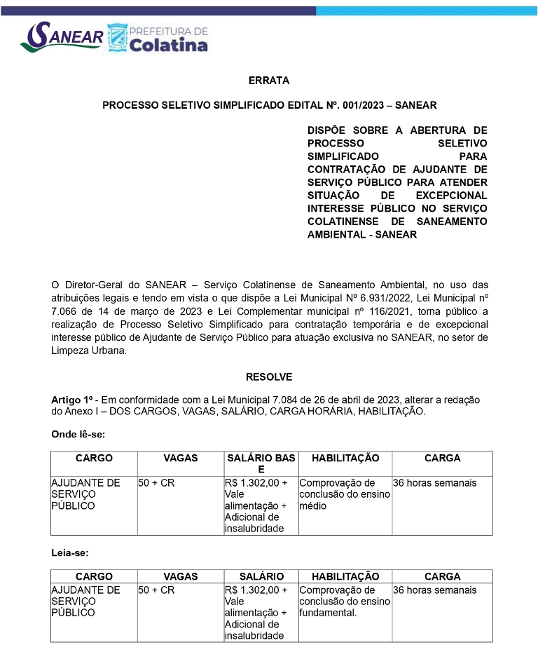 O Sanear realiza de 20/04 a 05/05/2023, inscrição para Processo Seletivo Simplificado para contração de Ajudante de Serviço Público que atenderá à demanda do setor de limpeza urbana.