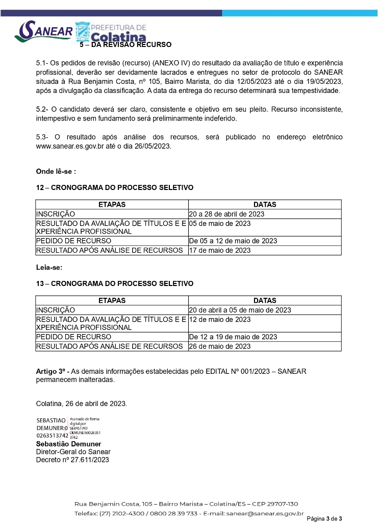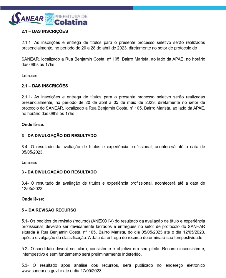 As inscrições e entrega de títulos para o processo seletivo serão realizadas presencialmente, no período de 20 de abril a 05 de maio de 2023, diretamente no setor de protocolo do SANEAR, localizado a Rua Benjamin Costa, nº 105, Bairro Marista, ao lado da APAE, no horário das 08hs às 17hs.