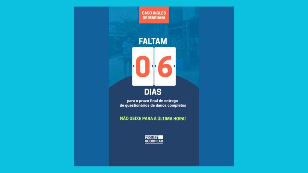 Todos os clientes do processo na Inglaterra por conta do rompimento da barragem de Fundão precisam completar o questionário de danos até o dia 31 de agosto. Isso é urgente. Essa é a última chance de completar essas informações, do contrário, o cliente, poderá ser removido da ação inglesa.