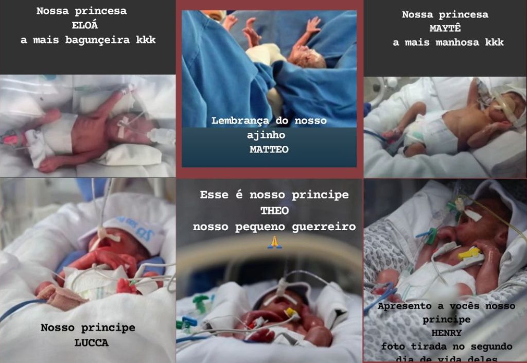 Nas fotos, os bebês são vistos com equipamentos de suporte respiratório, evidenciando o desafio que enfrentam desde o nascimento. Além de mostrar a doçura dos pequenos, os pais também atualizaram o público sobre o estado de saúde de Theo, Henry, Maytê, Lucca e Eloá, os cinco bebês sobreviventes.
