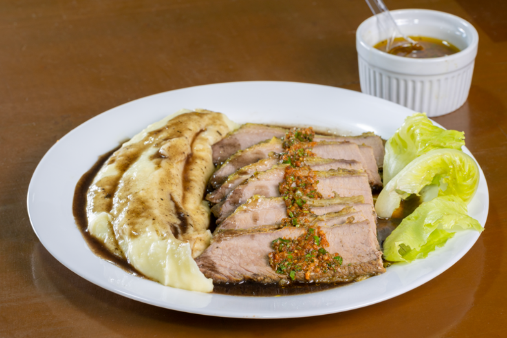 Prato: Ponta de Peito do Chef – deliciosa ponta de peito acompanhada de purê de batata.