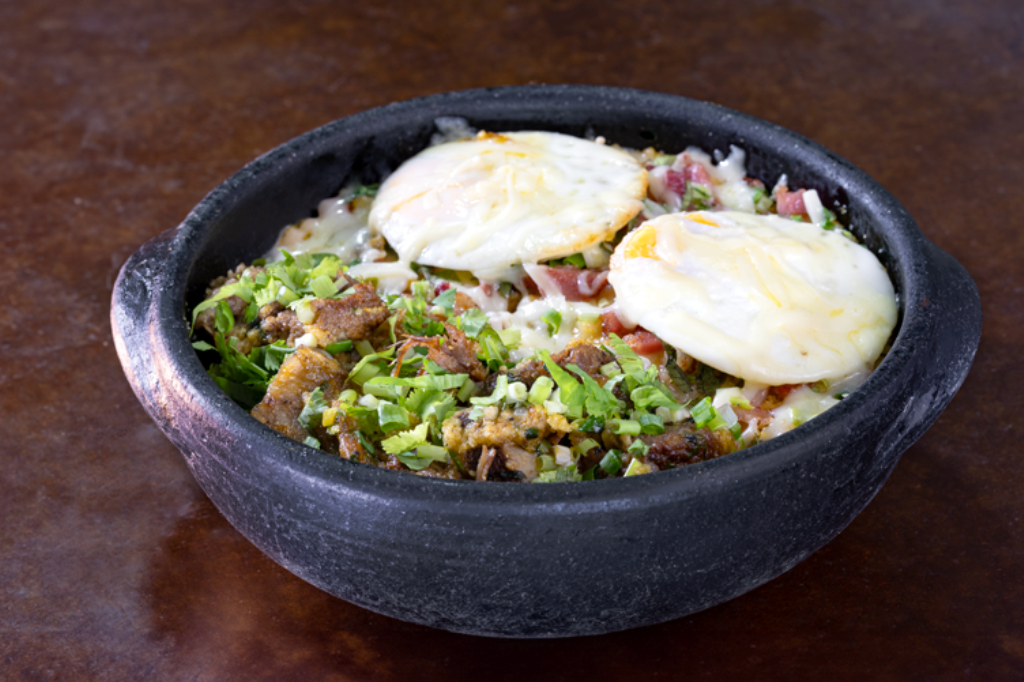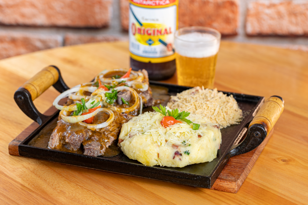 Prato: Costela de boi assada à moda caipira – Costela de boi assada, servida na chapa quente com purê de aipim e farofa de bacon.