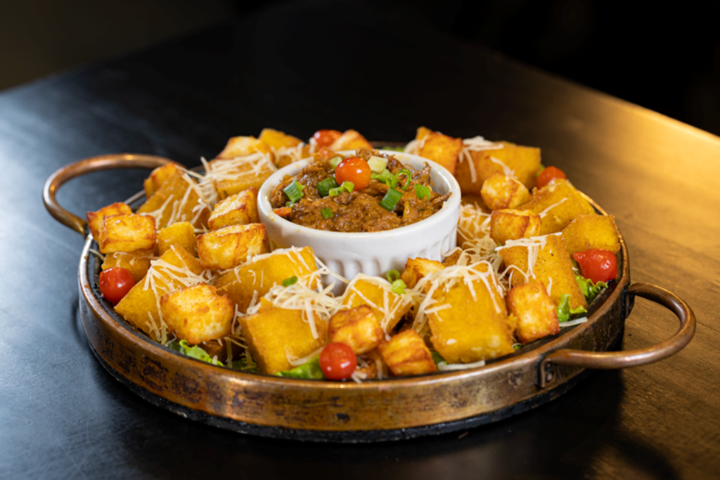 Prato: Rabada de Ladym – Rabada desfiada com polenta frita e dadinho de queijo da roça.