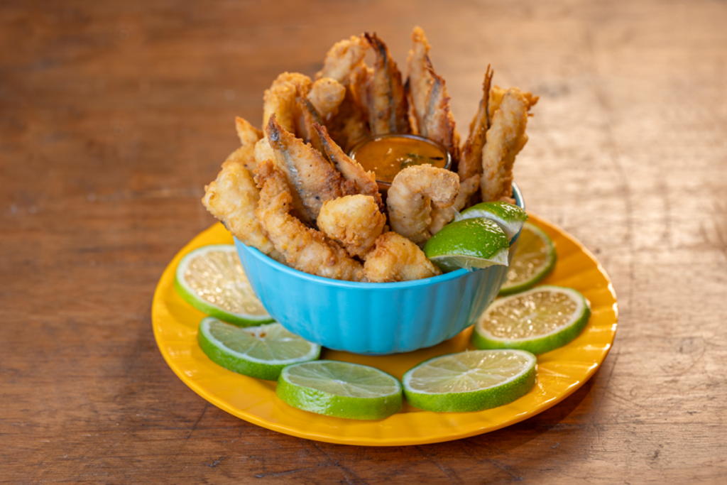 Prato: Puxada de rede – Iscas de filé de peroá, cação e piabinha fritas, com molho de pirão.