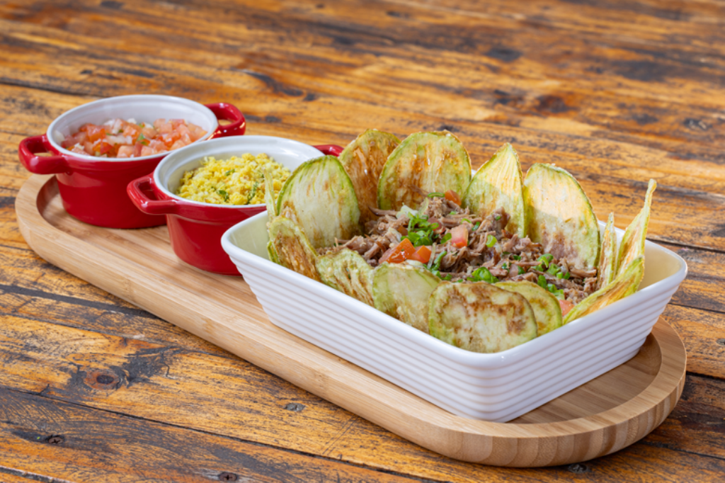 Prato: Cupinzeiro no Paiol – Cupim preparado na cerveja preta, servido com Chips de jiló, farofa de limão e vinagrete de pimenta biquinho.