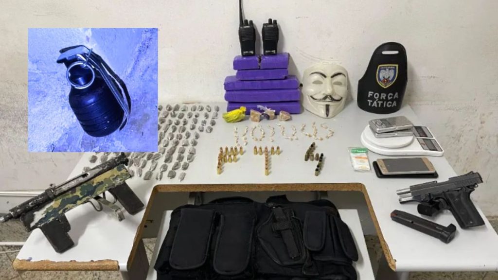 Ao entrar na residência, um outro homem foi abordado e durante a busca na casa, foram encontradas, além de uma granada de mão, uma submetralhadora e uma pistola municiada, além de munições, rádios comunicadores, drogas, balanças de precisão e celulares.