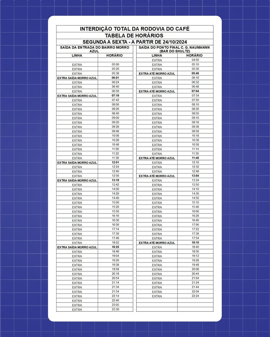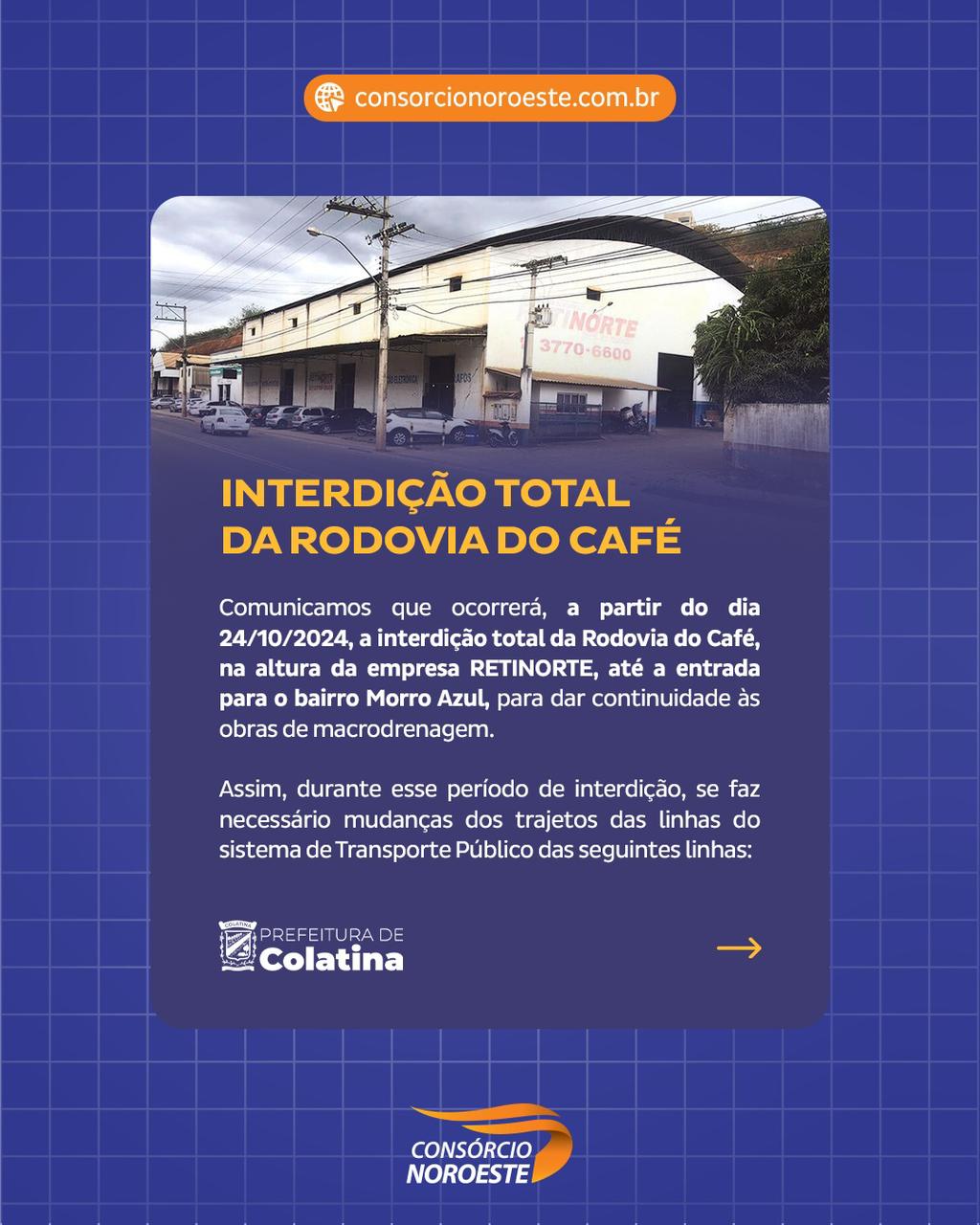 Leia maisAtenção, motoristas e usuários do transporte público: a Rodovia do Café, no trecho que compreende a empresa Retinorte até a entrada do bairro Morro Azul, em Colatina, estará totalmente interditada entre os dias 24 e 29 de outubro de 2024.