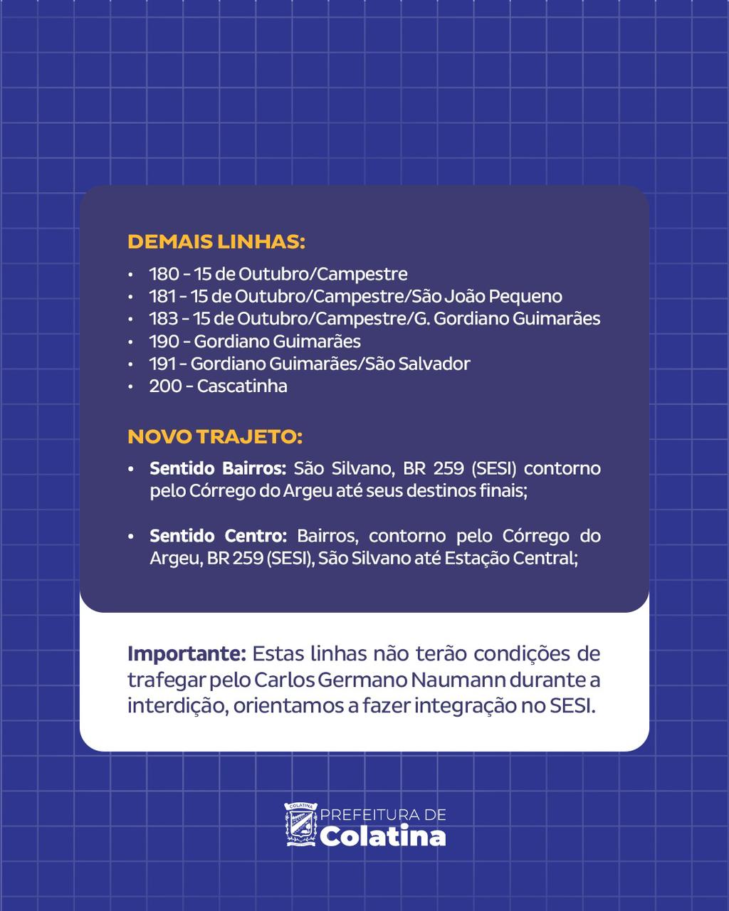 A alteração de trajetos impactará também o sistema de transporte coletivo. Confira as mudanças específicas das linhas :