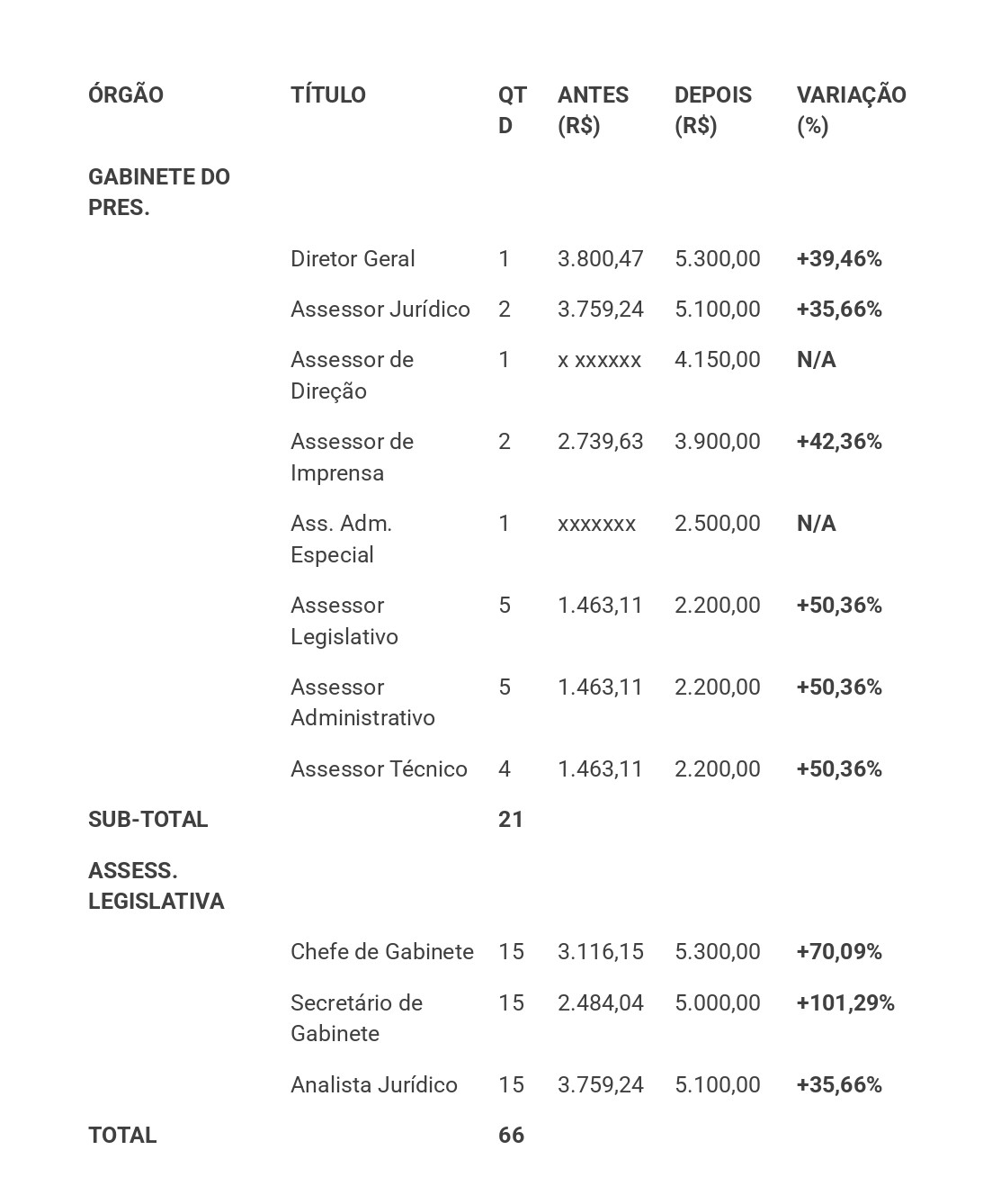 Ainda de acordo com a Mesa Diretora da Câmara o projeto de lei é acompanhado de um Estudo de Impacto Orçamentário-Financeiro, o projeto demonstra que as mudanças estão dentro dos limites legais de gastos com pessoal, que não podem ultrapassar 70% da receita municipal, conforme a Constituição Federal.