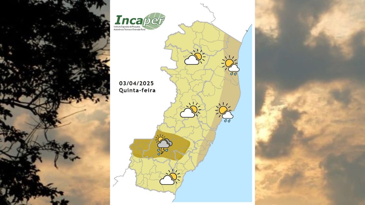 A quinta-feira (03) será com sol e variação de nebulosidade, em todo o Estado. Chove pela manhã, no litoral nordeste e na Grande Vitória, em virtude a entrada de umidade do mar, trazida por ventos costeiros, com abertura de nuvens no decorrer do dia. Na região Serrana, aumento de nuvens durante o dia, com previsão de pancadas de chuva entre a tarde e noite. Nas demais áreas do Espírito Santo, não há previsão de chuva.