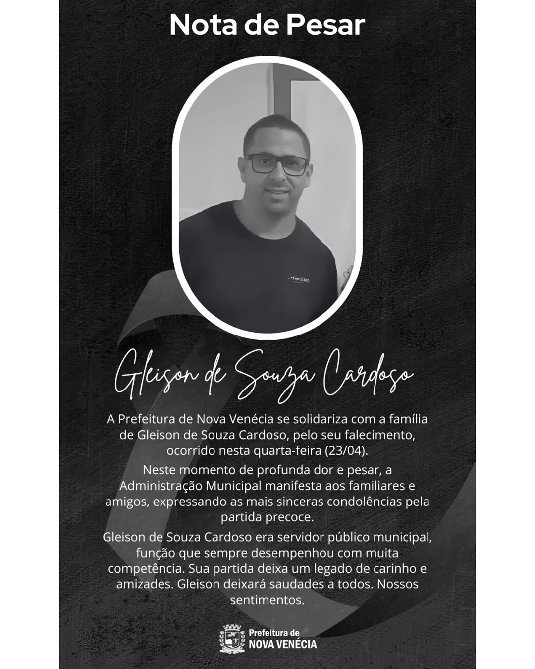 Na quarta-feira (23/04), faleceu Gleison de Souza Cardoso, popularmente conhecido como Gleisinho. Ele era servidor público municipal de Nova Venécia e uma figura querida na comunidade. Gleison sofreu um desmaio durante uma partida de futebol no Ginásio Municipal. Apesar de receber socorro imediato e ser encaminhado ao Hospital São Marcos, ele não resistiu e veio a óbito. A causa provável foi um infarto.