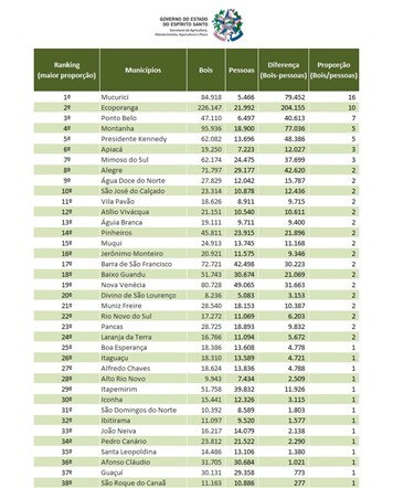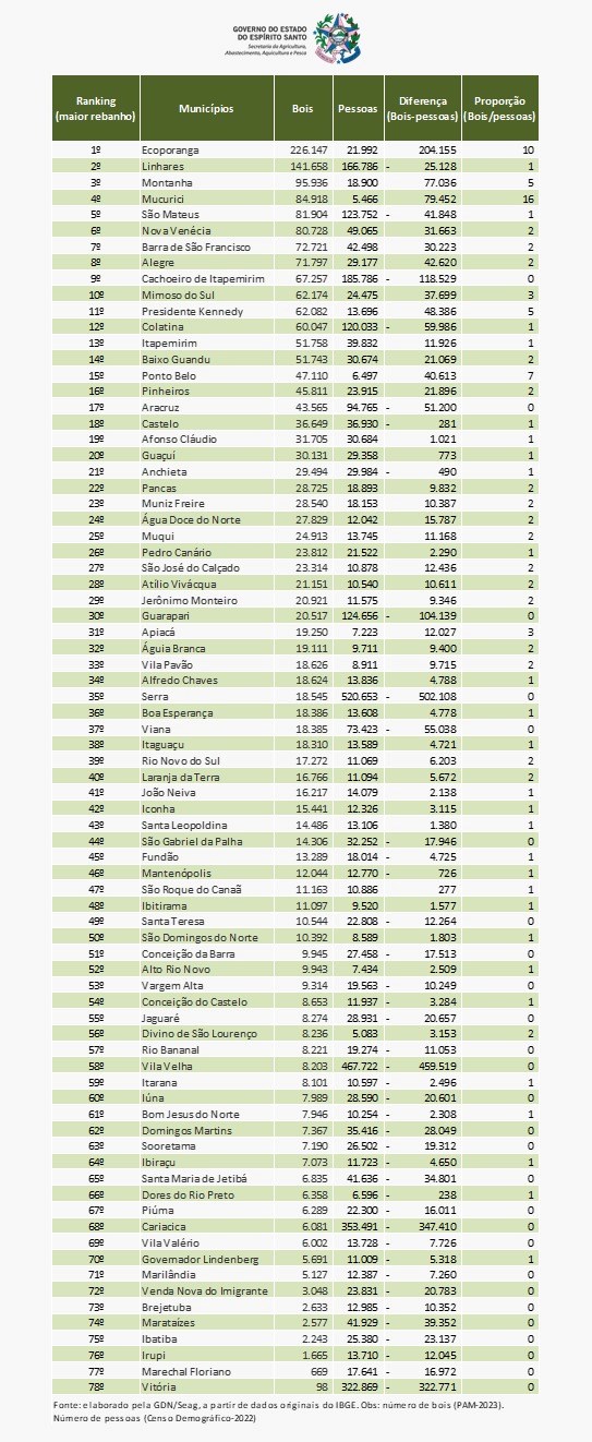 Municípios como Ponto Belo, Montanha e Presidente Kennedy também se destacam na proporção de bois por pessoa. A bovinocultura impulsiona a economia rural, gerando empregos, movimentando o transporte rural, fortalecendo a cadeia de laticínios e contribuindo para a arrecadação municipal.