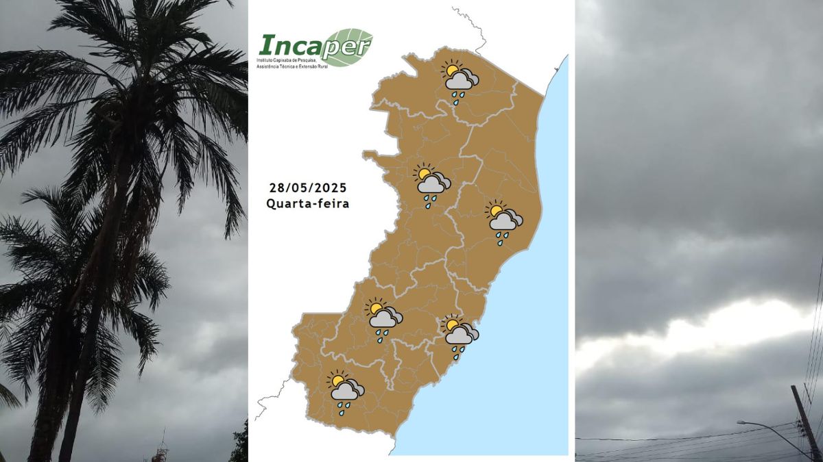 Na quarta-feira, com muitas nuvens, em todo o Estado, devido ao padrão de ventos costeiros, que trazem umidade do mar, e favorece a formação de instabilidade no Espírito Santo. Previsão de chuva, em alguns momentos do dia, em todas as regiões, sendo menos frequente na região Sul e trechos da região Serrana. O vento sopra com intensidade fraca a moderada pelo litoral, com possibilidade de rajadas no litoral sul. As temperaturas se mantém estáveis em todas as regiões.