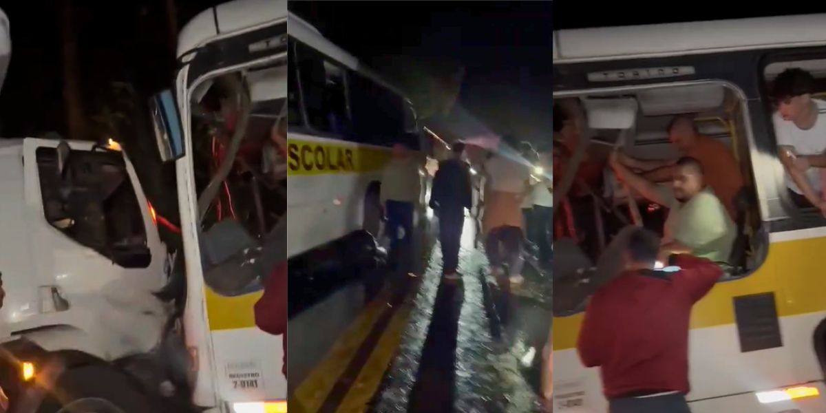 De acordo com um relato enviado à redação, o caminhão bateu de frente com o ônibus que transportava os alunos. Em seguida, outro ônibus colidiu na traseira do veículo dos estudantes. O motorista ficou preso nas ferragens, mas foi resgatado e passa bem.