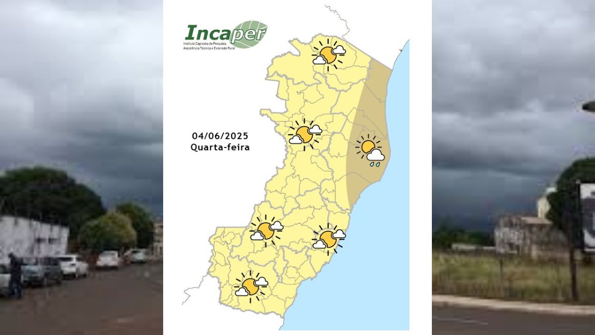Nesta quarta-feira (04), a instabilidade perde força no Espírito Santo. Há previsão de chuva rápida durante a madrugada e manhã apenas no litoral norte, com tendência de tempo aberto nos demais períodos. Poucas nuvens nas demais áreas do estado, inclusive na Grande Vitória, sem chance de chuva. O vento sopra com intensidade fraca a moderada no litoral, com possibilidade de rajadas no litoral sul.