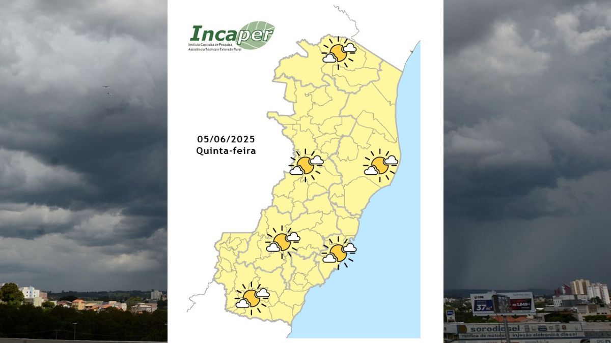 Na quinta-feira (05), o tempo segue aberto em todo o Espírito Santo, devido à atuação do ar seco associado a um sistema de alta pressão. Não há previsão de chuva no estado. O vento sopra com intensidade fraca a moderada no litoral, com possibilidade de rajadas entre o litoral sul e o litoral metropolitano.