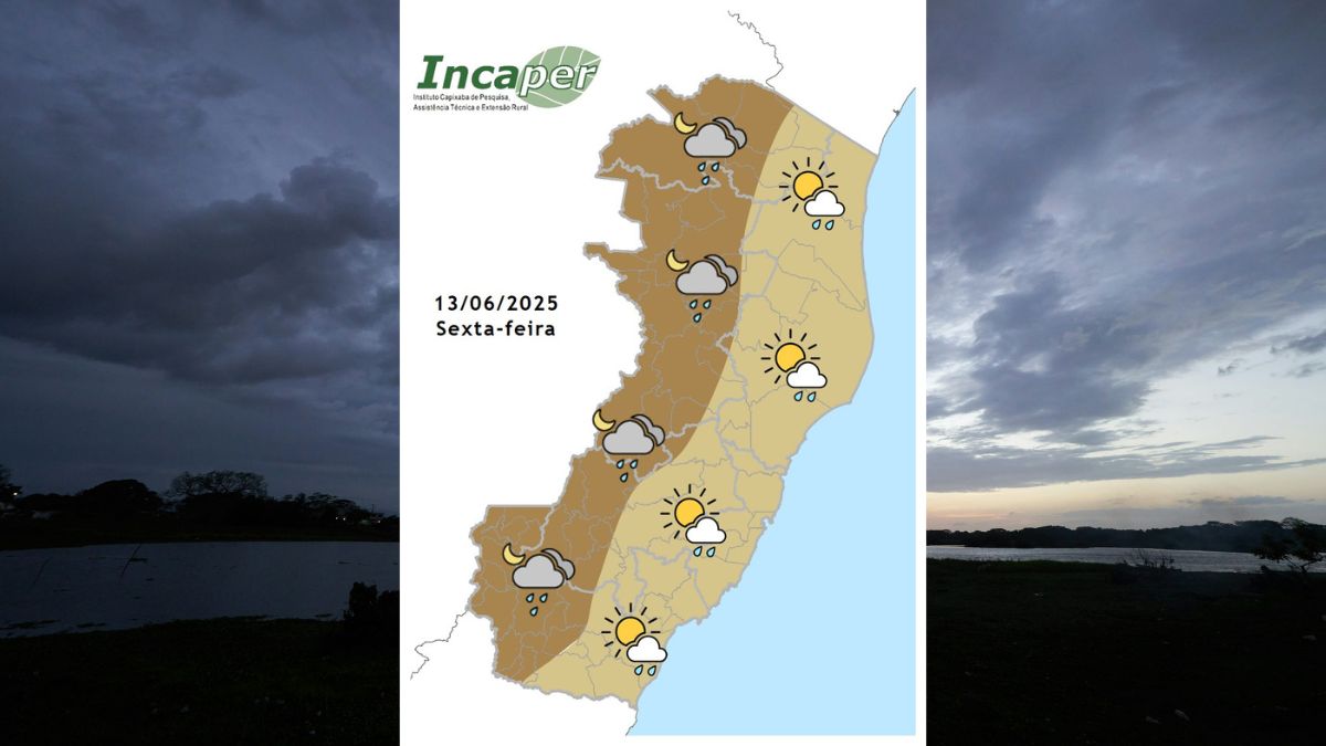 A sexta-feira (13) será com sol e variação de nuvens no litoral capixaba, associada aos ventos úmidos e costeiros. Chove em alguns momentos do dia, na faixa leste do Espírito Santo. Nas regiões mais afastadas do litoral, o dia será com sol e aumento de nuvens, com chuva a partir do final da tarde e noite. As temperaturas seguem baixas em grande parte do Estado.
