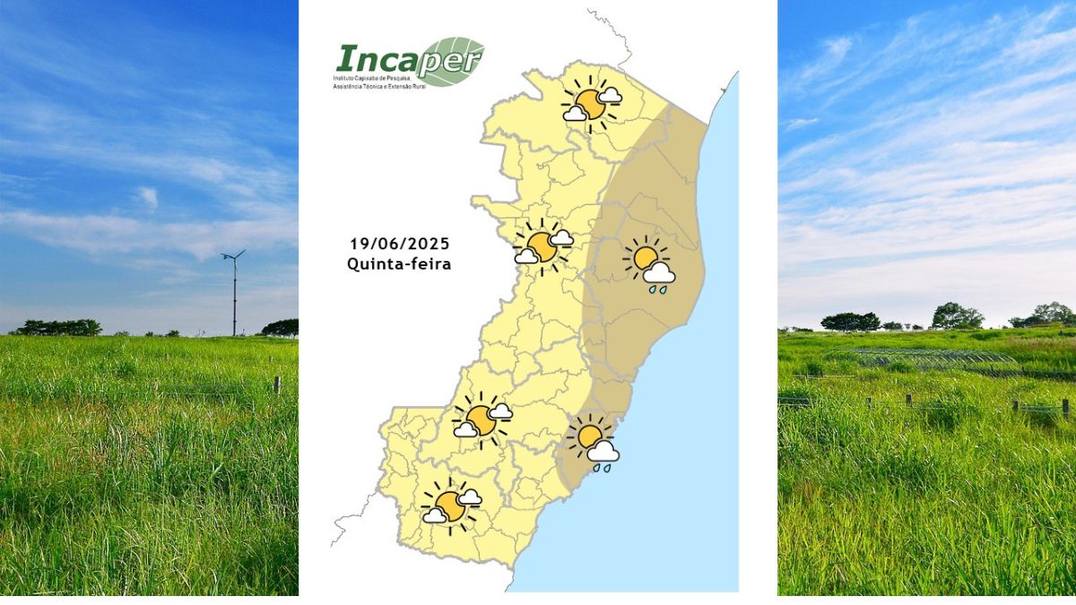 Nesta quinta-feira (19) de feriado, último dia do outono no Hemisfério Sul, a umidade trazida pelos ventos costeiros deixa o tempo instável em parte do Espírito Santo. Previsão de chuva rápida entre a madrugada e a manhã na Grande Vitória e na Região Nordeste, com tendência de tempo aberto nos demais períodos. Nas demais áreas do estado, poucas nuvens e sem previsão de chuva. O vento sopra com intensidade fraca a moderada no litoral, com possibilidade de rajadas no litoral sul.