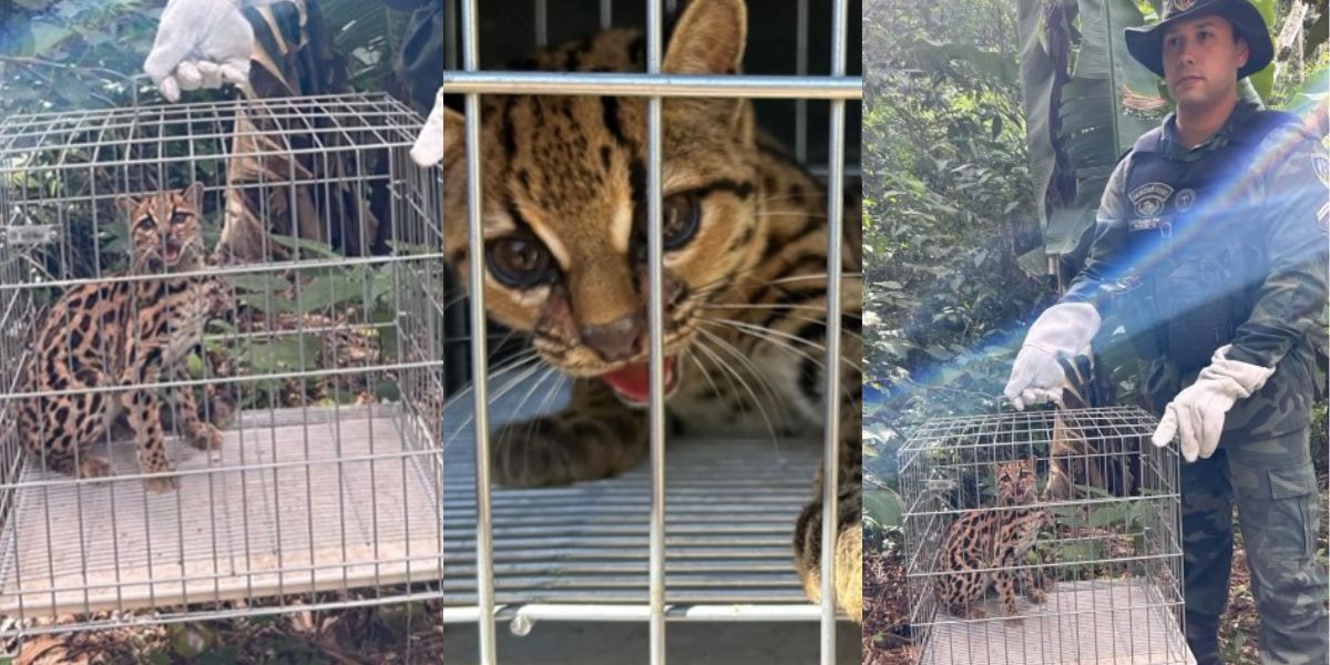 Um gato-maracajá (Leopardus wiedii), felino silvestre nativo da Mata Atlântica e considerado vulnerável à extinção no Brasil, foi resgatado na manhã desta sexta-feira (20) no município de Mimoso do Sul, na região Sul do Espírito Santo. A ação foi conduzida por uma equipe da 4ª Companhia do Batalhão de Polícia Militar Ambiental (BPMA), com o apoio de biólogos da Environlink e de um agente do Instituto Estadual de Meio Ambiente e Recursos Hídricos (IEMA).