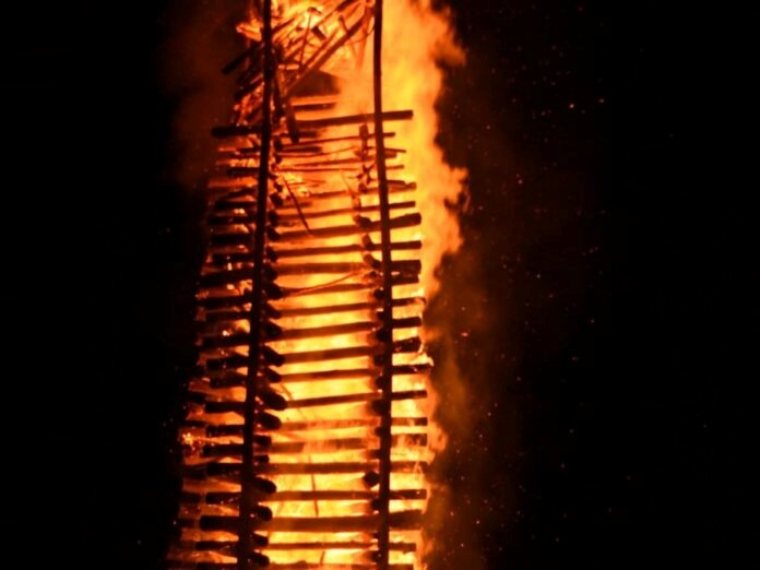 A construção da fogueira foi uma operação logística complexa, que demandou cerca de uma semana de trabalho. De acordo com Ramon Vetoraci, responsável pela montagem, o processo teve início na terça-feira (17), com a extração de quatro toras de eucalipto que serviram como base da estrutura. As madeiras foram doadas e localizadas a mais de 21 quilômetros do local da festa, exigindo que parte do trajeto fosse feito com tração e transporte especial devido ao tamanho das peças.