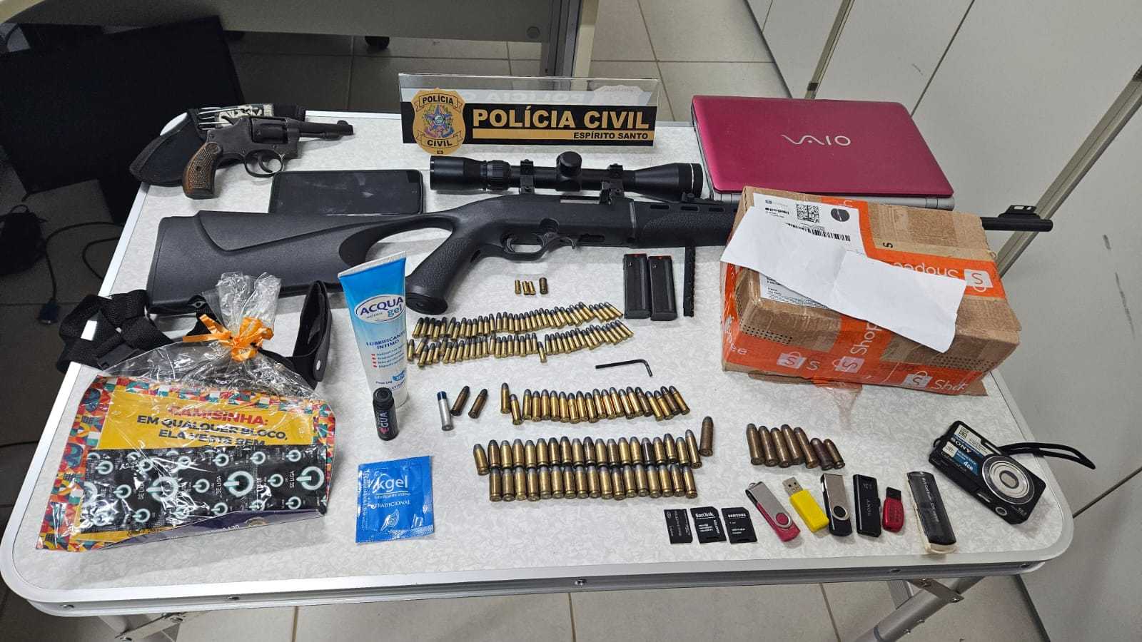 A Polícia Civil do Espírito Santo (PCES), por meio da 14ª Delegacia Regional de Barra de São Francisco, prendeu, nesta sexta-feira (04), um policial militar reformado, de 62 anos, suspeito de estupro de vulnerável, contra as filhas. Durante o cumprimento de mandado de busca e apreensão, foram localizados uma carabina calibre .22 com luneta, um revólver calibre .32, diversas munições, carregadores, uma máquina fotográfica, um notebook, pen drives e produtos de conteúdo erótico.