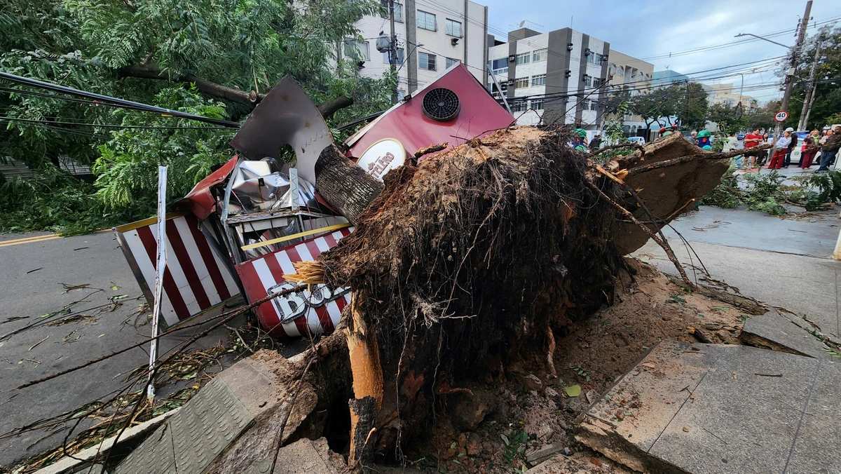 Imagens registradas logo após o ocorrido mostram a raiz da árvore completamente arrancada do solo, evidenciando a força do vendaval. O food truck, que aparentemente estava em operação ou estacionado no ponto de venda, ficou completamente amassado e inutilizado sob os galhos e o tronco da árvore.