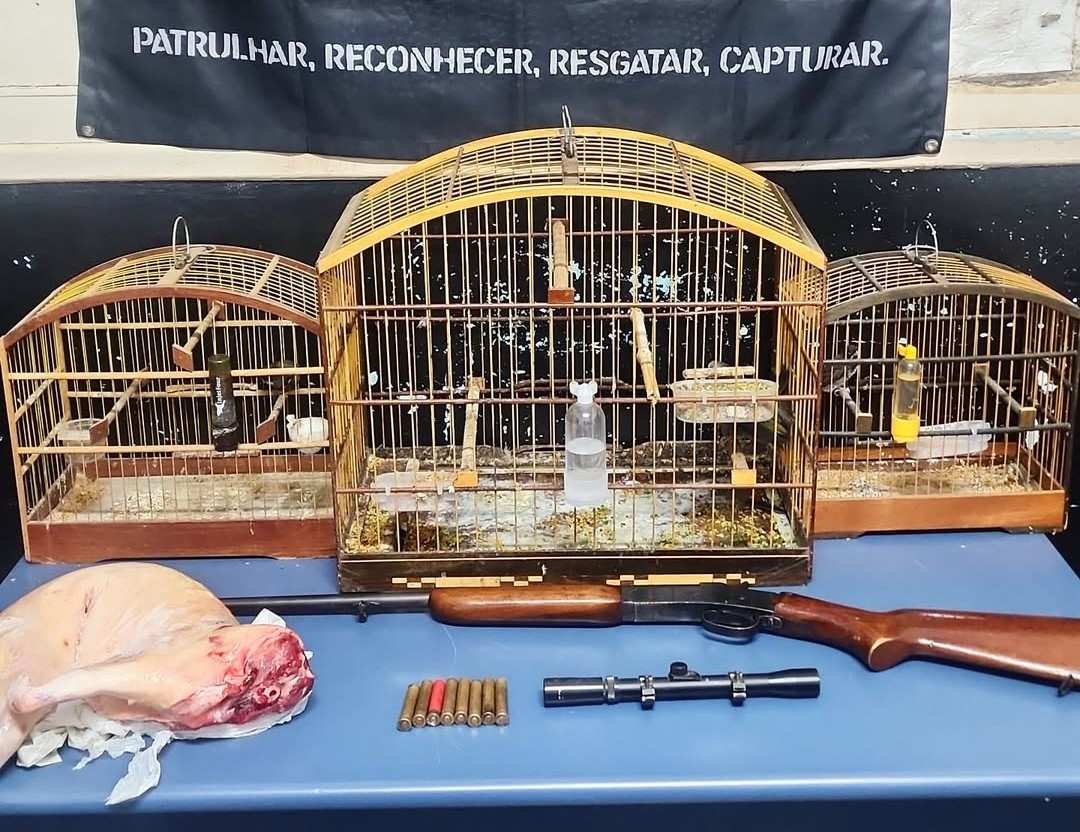 A equipe do Comando de Operações Táticas em Mata Atlântica (COTAMA), do Batalhão de Polícia Militar Ambiental (BPMA), apreendeu uma espingarda calibre 36, oito munições do mesmo calibre, uma luneta, dois coleiros, um trinca-ferro e uma paca abatida.