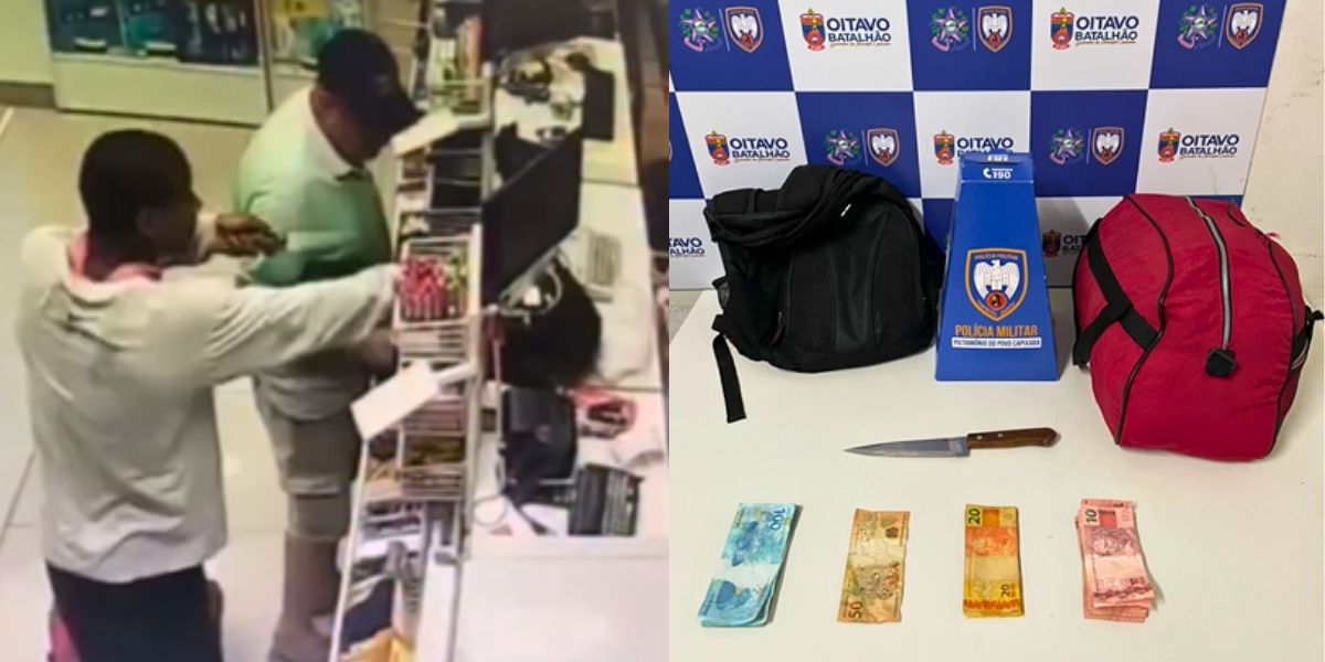 Minutos após os assaltos, o homem foi localizado e detido pelos militares. Com a prisão, a PM apreendeu a faca utilizada e conseguiu recuperar o valor exato de R$ 1.030,00.