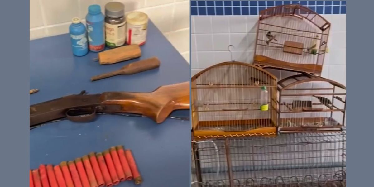 Durante a fiscalização no local indicado, os policiais constataram irregularidades ambientais e apreenderam armas de fogo, munições, armadilhas utilizadas para a caça, além de pássaros silvestres mantidos em cativeiro de forma irregular, sem a devida autorização dos órgãos ambientais competentes.
