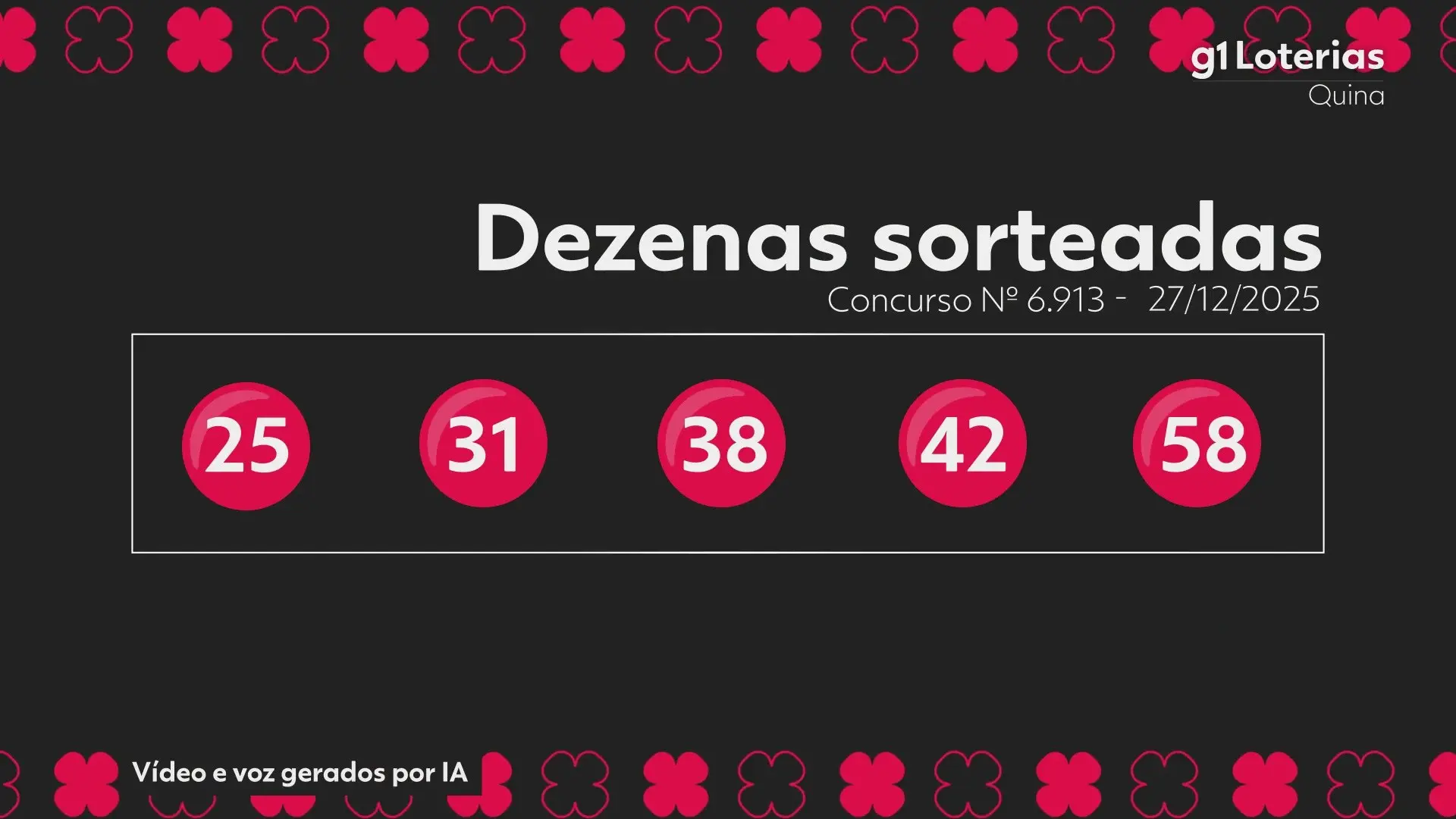 A Caixa Econômica Federal divulgou o resultado do concurso 6913 da Quina, sorteado neste sábado (27). Uma aposta foi a grande vencedora, acertando os cinco números sorteados e levando o prêmio principal. A estimativa para o prêmio do próximo concurso, que acontecerá na segunda-feira (29), é de R$ 600 mil.