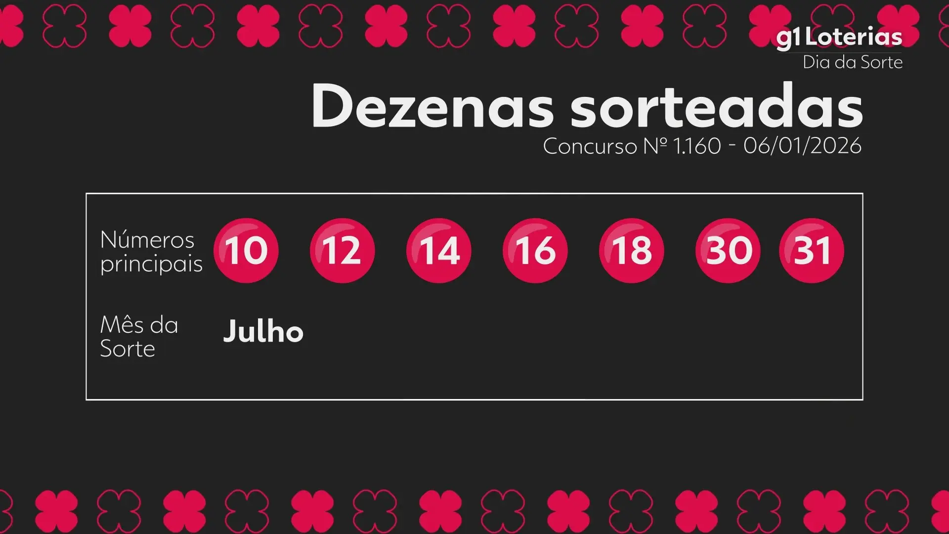 O concurso 1160 da loteria Dia de Sorte, realizado nesta terça-feira (6), teve três apostas ganhadoras na faixa principal, cada uma levando R$ 67.083,57 por acertarem os 7 números sorteados. A Caixa Econômica Federal, responsável pela administração da loteria, informou que a estimativa para o prêmio do próximo concurso, que acontece na quinta-feira (8), é de R$ 150.000,00.