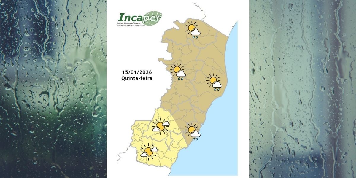 Nesta quinta-feira (15), a umidade transportada pelos ventos costeiros provoca chuva na madrugada e pela manhã na Grande Vitória e na Região Nordeste, com tempo aberto nos demais períodos. Há previsão de chuvas rápidas ao longo do dia nas demais áreas do norte capixaba e no trecho leste da Região Serrana. Não há previsão de chuva nas demais áreas do estado. As temperaturas máximas apresentam ligeira queda, e o vento sopra fraco a moderado no litoral.