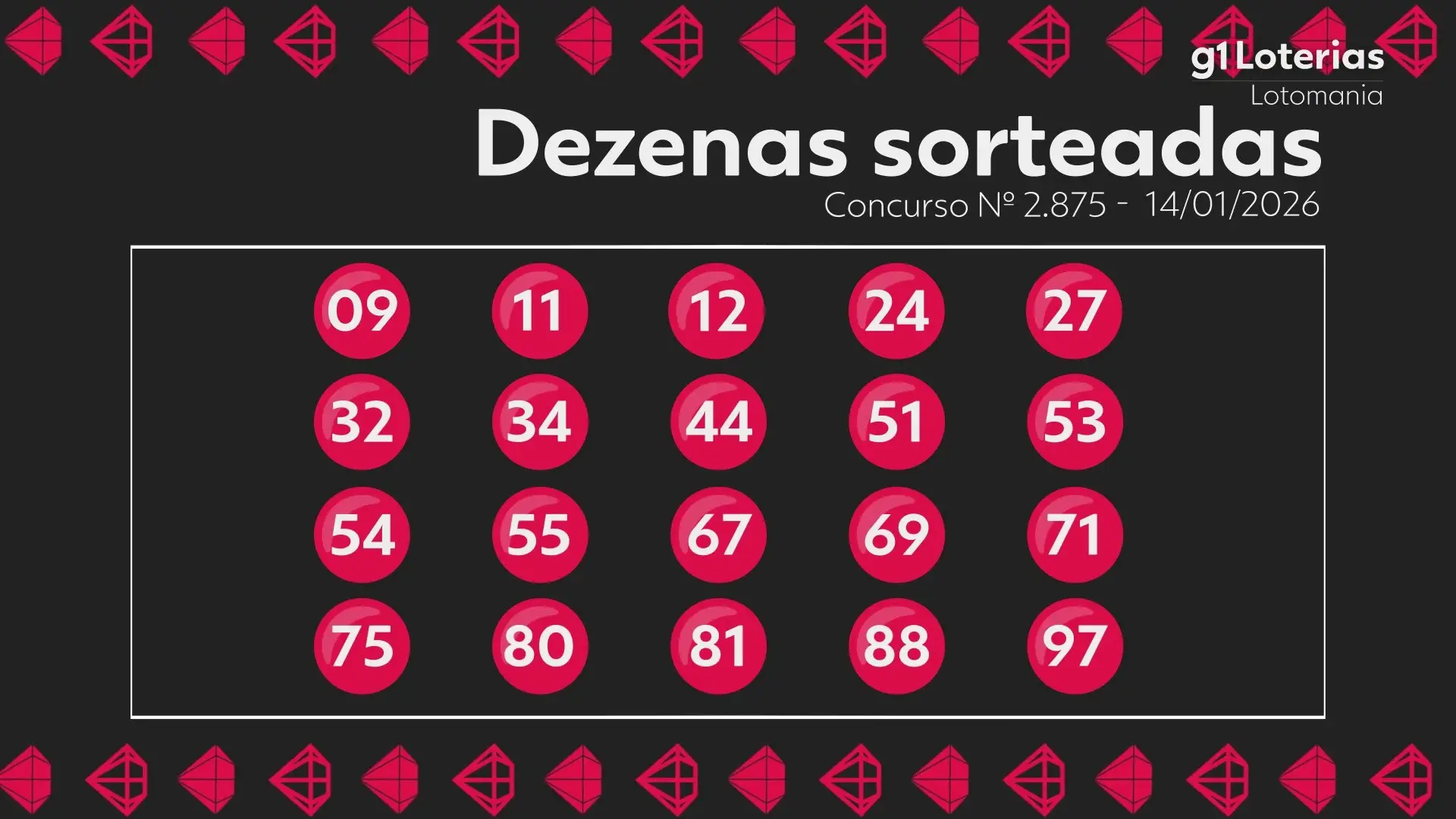 Os números que não trouxeram a sorte grande para nenhum apostador nesta quarta foram: 9 – 11 – 12 – 24 – 27 – 32 – 34 – 44 – 51 – 53 – 54 – 55 – 67 – 69 – 71 – 75 – 80 – 81 – 88 – 97.