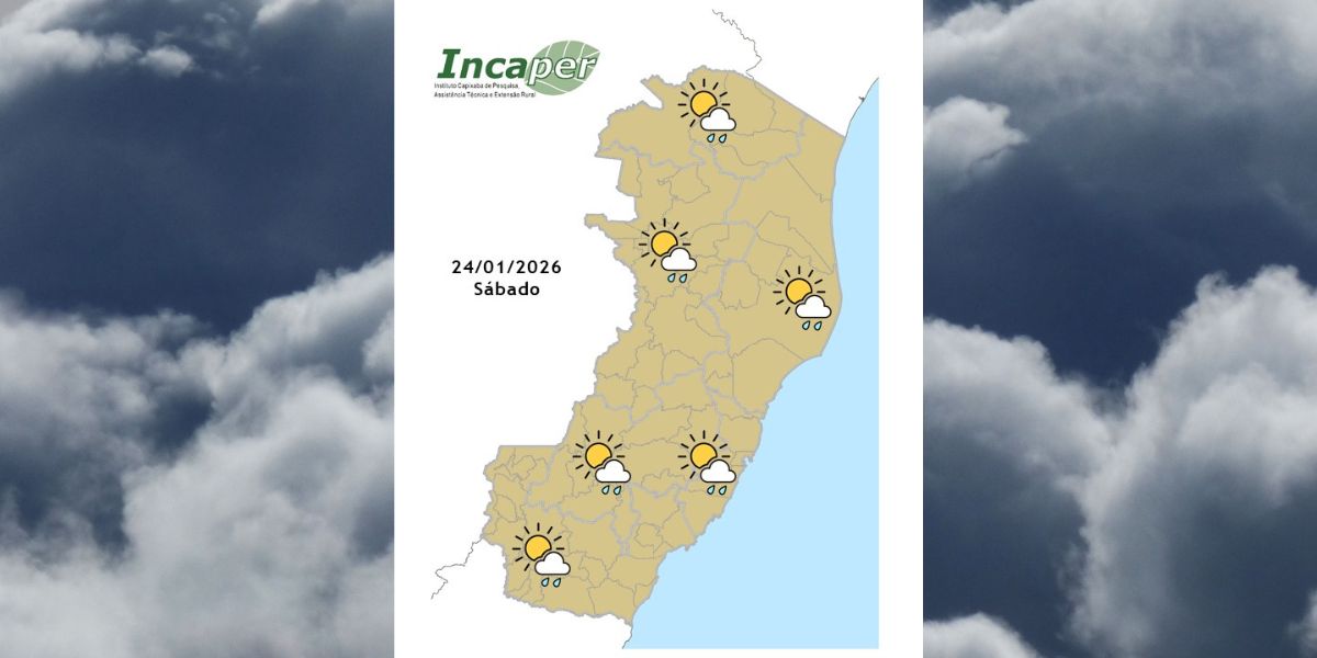 Neste sábado 24) a umidade transportada pelos ventos costeiros mantém o tempo instável no Espírito Santo, com previsão de chuva em alguns períodos do dia em todas as regiões. As temperaturas máximas apresentam aumento na metade sul, e o vento sopra fraco a moderado no litoral.